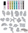 El juego incluye 18 alfileres (pins) metálicos plateados, 8 colores de purpurina en prácticos recipientes de tubo, 18 alfileres adhesivos e instrucciones fáciles de seguir.